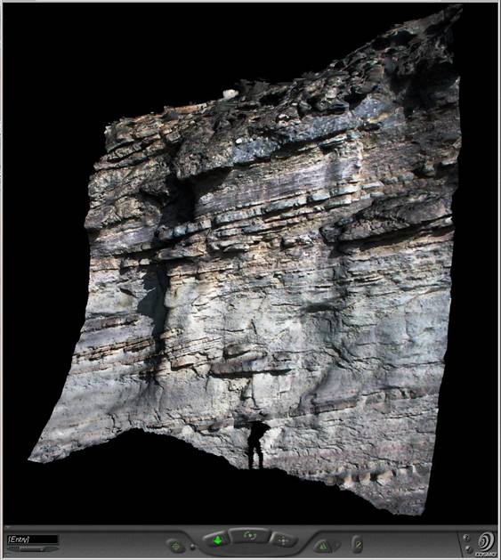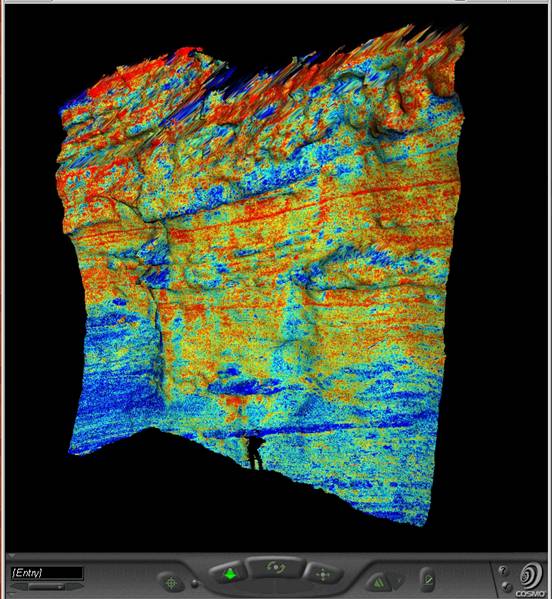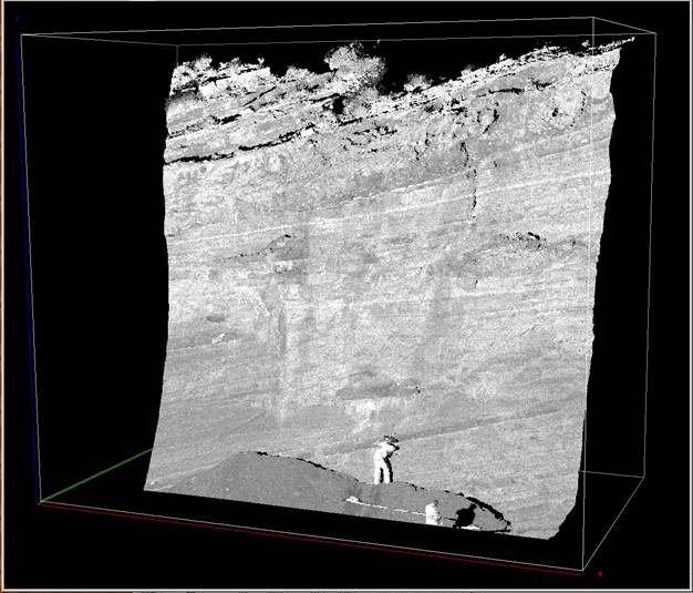 Figure 1. Laser point cloud data set at 1 cm xyz point spacing. Human in front near outcrop is approximately 6 feet tall.